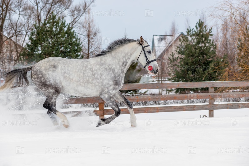 Чистокровная лошадь мчится по полю зимой