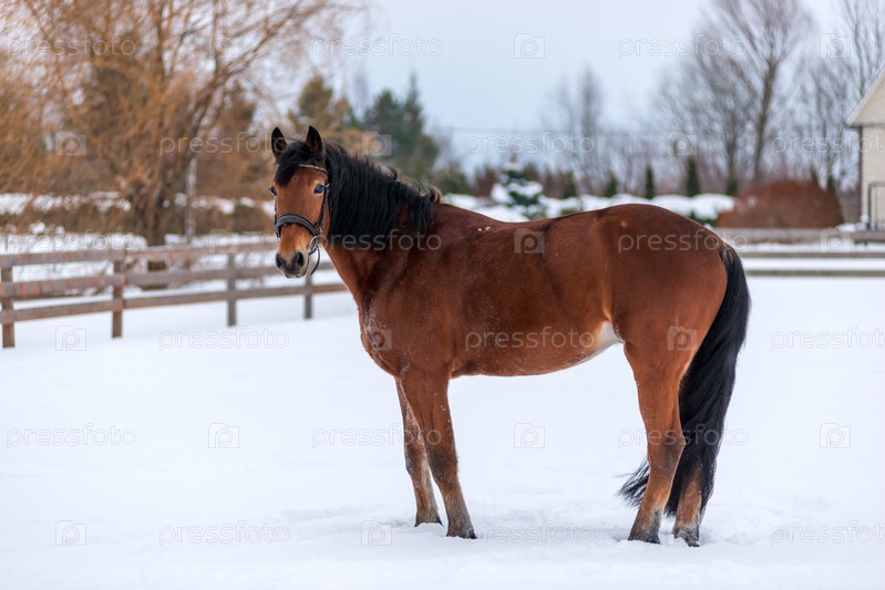 Красивая чистокровная коричневая лошадь на снегу