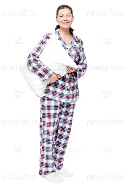 Красивая девушка в пижаме и тапочках, обнимая подушку