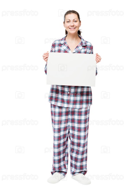 Брюнетка в пижаме с пустым плакатом на белом фоне