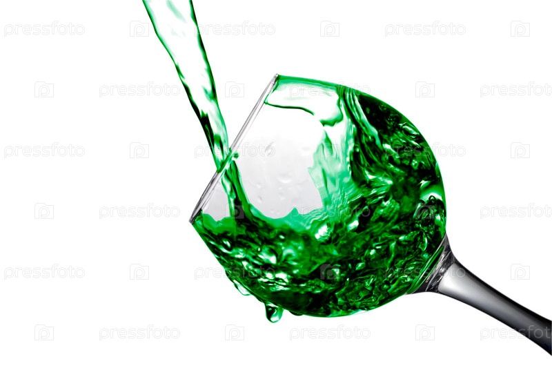 Зеленая вода наливается в стакан на белом фоне
