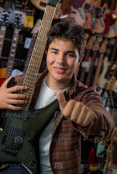 Молодой человек играет на гитаре в магазине
