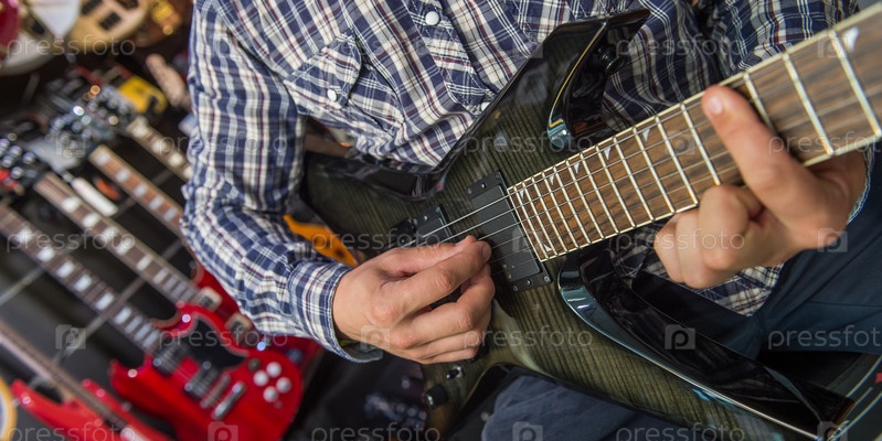 Молодой человек играет на гитаре в магазине