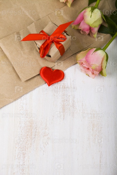 Розовые розы, подарок и сердце