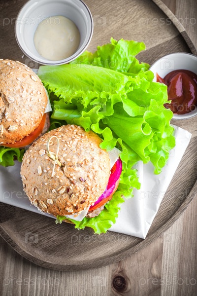 Чизбургер с салатом, луком помидорами и свежим хлебом