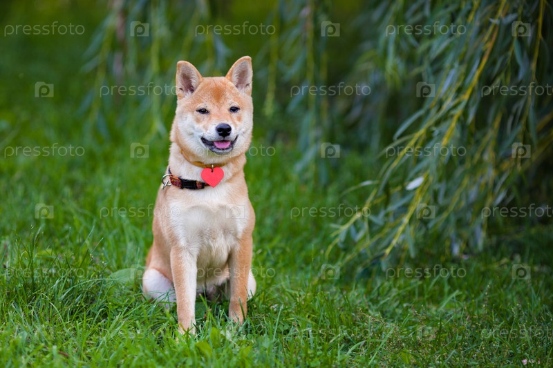 Молодой шиба-ину в зеленом саду