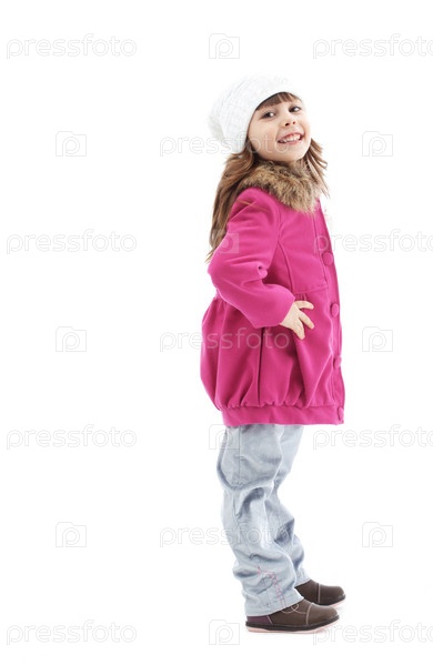 Милая маленькая девочка позирует в розовом пальто