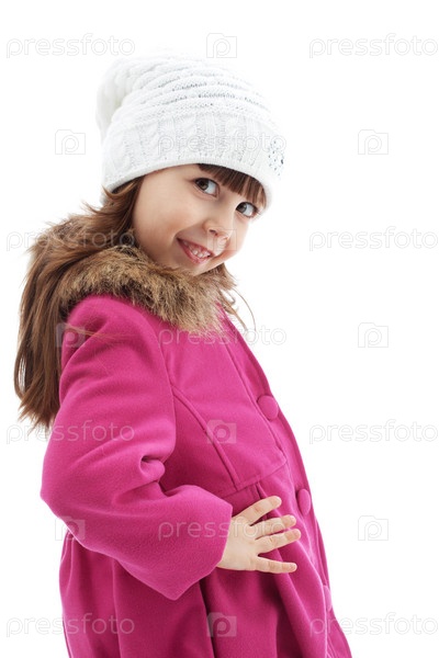 Милая маленькая девочка позирует в розовом пальто