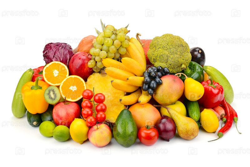 Фрукты и овощи на белом фоне