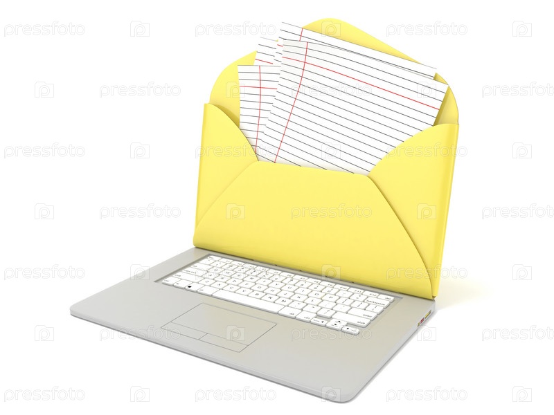 Открытый конверт и пустой лист бумаги на ноутбуке. 3D