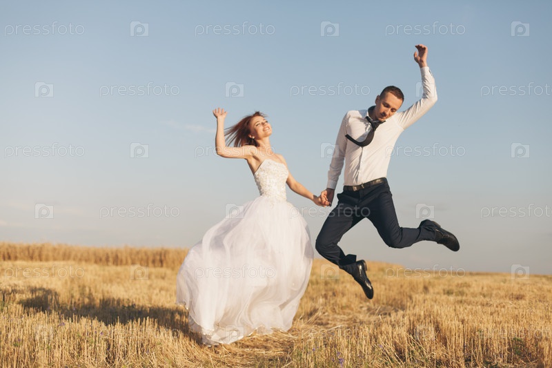 Великолепные невесты и жених в пшеничном поле