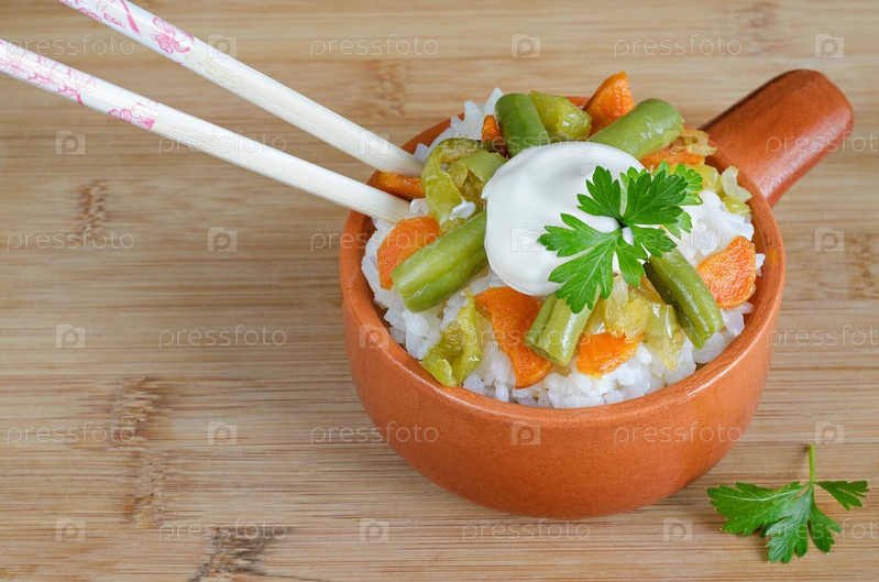 Вареный рис и овощи в керамической миске