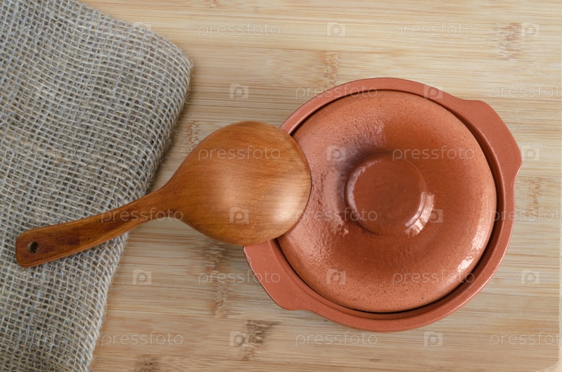 Керамический горшок и деревянная ложка