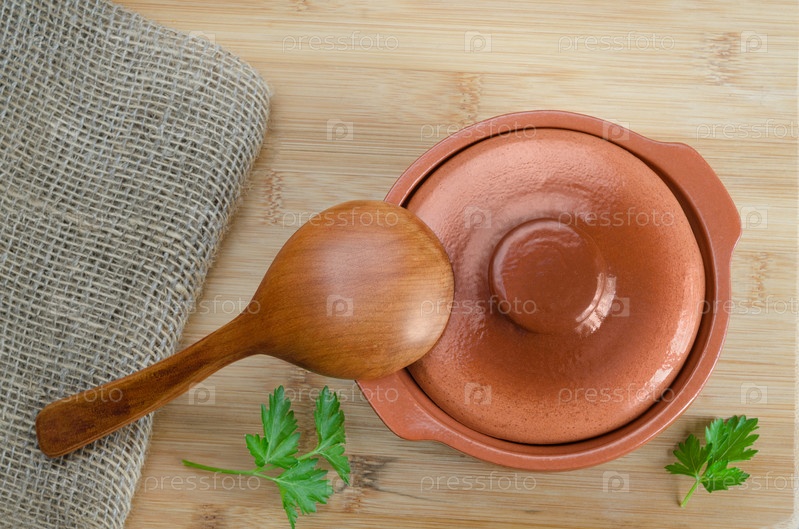 Керамический горшок и деревянная ложка