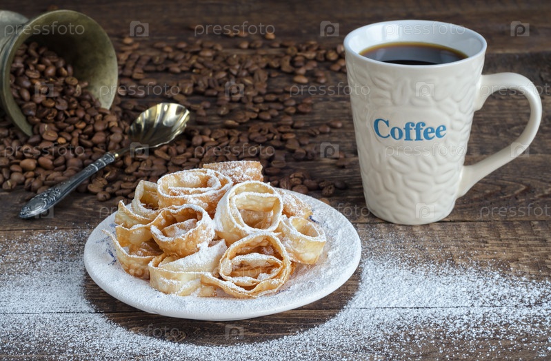 Хрустящее печенье в сахарной пудре и кружкой кофе