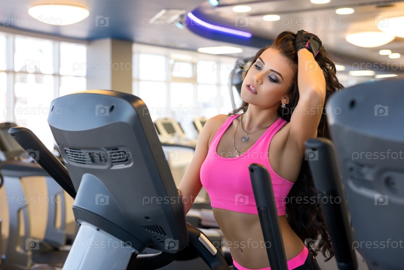 Красивая брюнетка в сексуальном розовом лифе на беговой дорожке