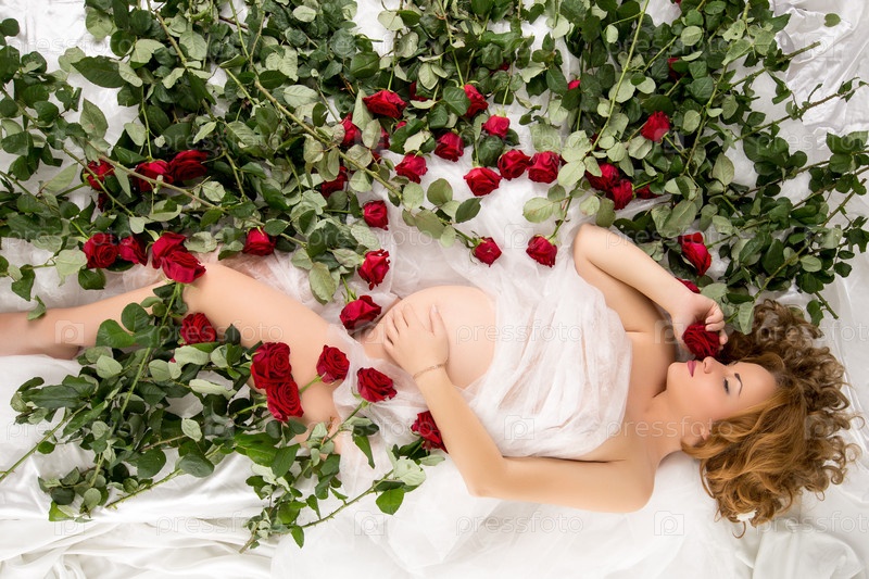 Беременная женщина в постели с розами