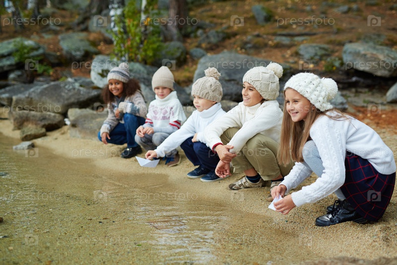 Улыбающиеся дети, сидя у воды
