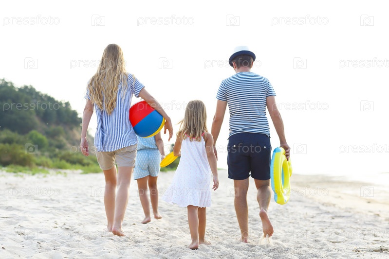 Молодая семья на пляже на закате