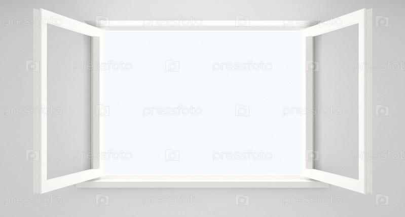 Открытое окно с двумя створками в пустой белой комнате