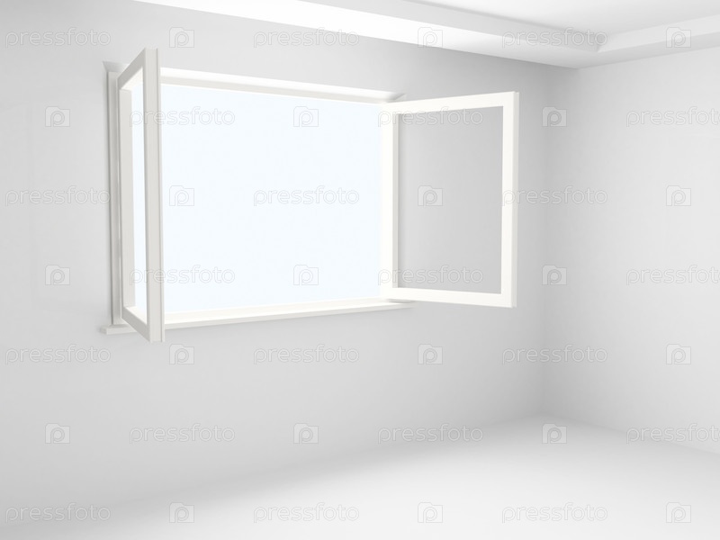 Открытое окно с двумя створками в пустой белой комнате