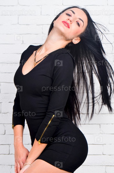Брюнетка в черном платье возле белой кирпичной стены