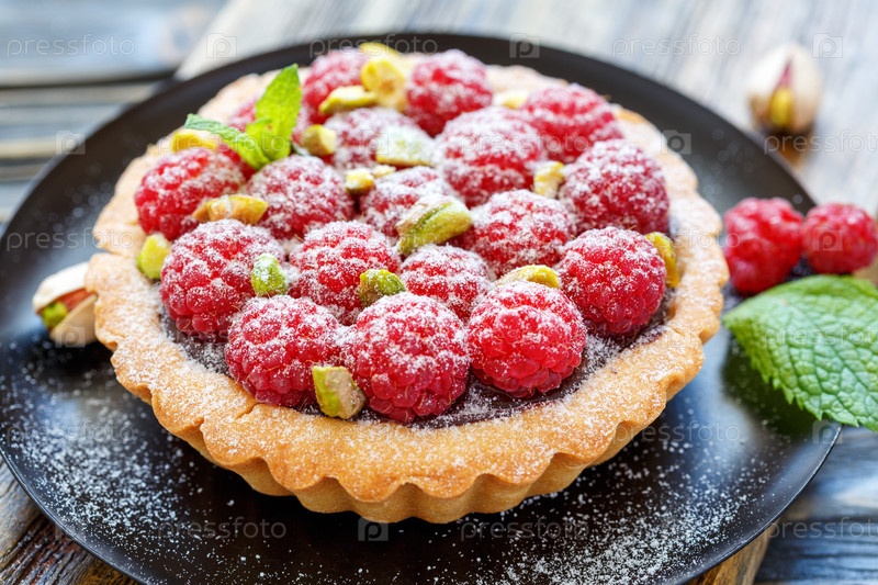 Торт с шоколадом, фисташками и свежей малиной