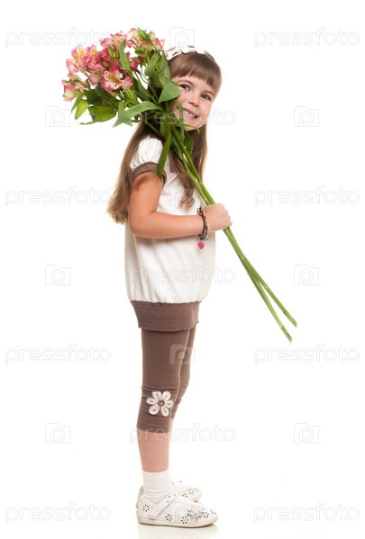 Симпатичная девочка держит букет цветов на белом фоне