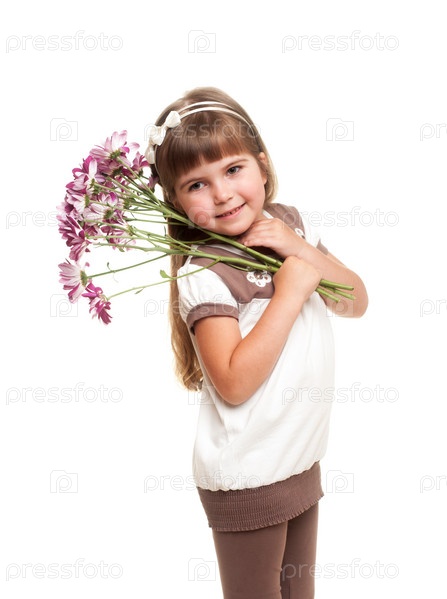 Симпатичная девочка держит букет цветов на белом фоне