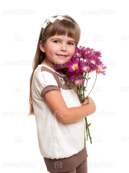 Симпатичная девочка держит букет цветов на белом фоне