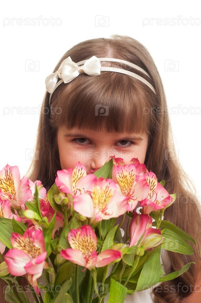 Симпатичная девочка держит букет цветов на белом фоне