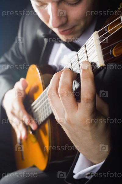 Игра на гитаре. Музыкальный инструмент в руках исполнителя
