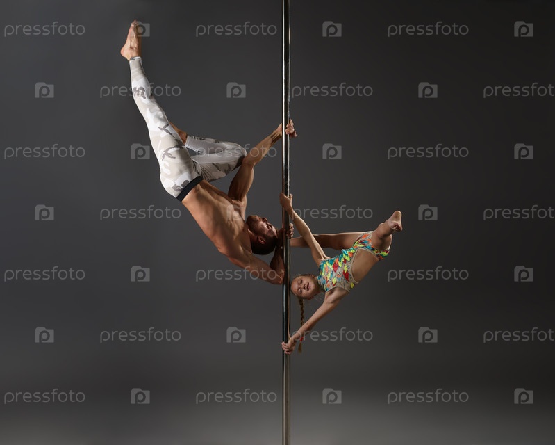 Танцоры делают упражнение в паре на пилоне