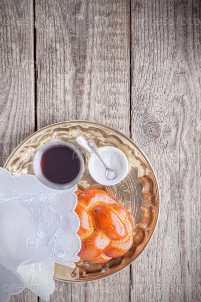 Вино, хала на деревянной поверхности. Еврейская суббота