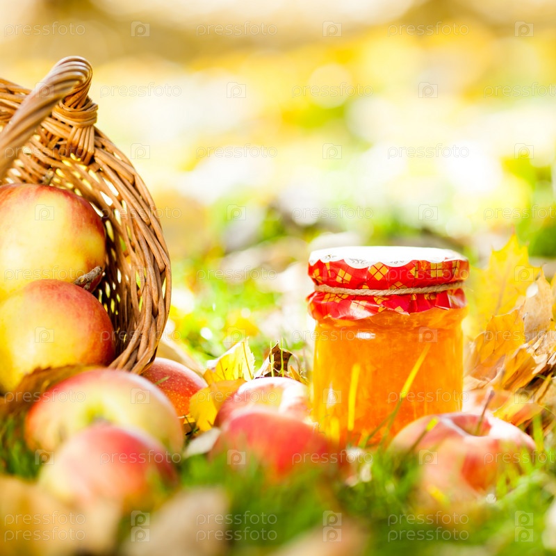 Домашнее варенье в стеклянной банке и корзина, полная свежих красных яблок в осеннем саду