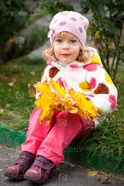 Девочка с букетом желтых осенних листьев в осеннем парке