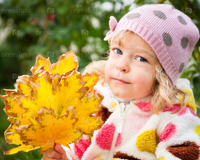 Девочка с букетом желтых осенних листьев в осеннем парке