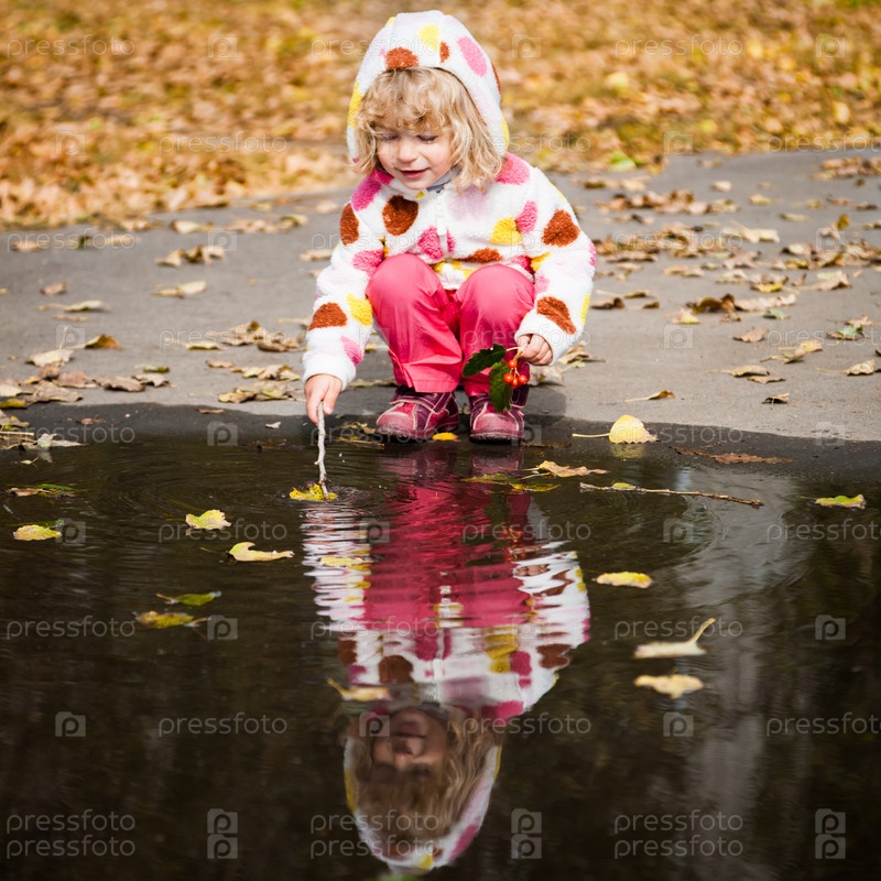 Счастливый ребенок, играющий в луже в осеннем парке