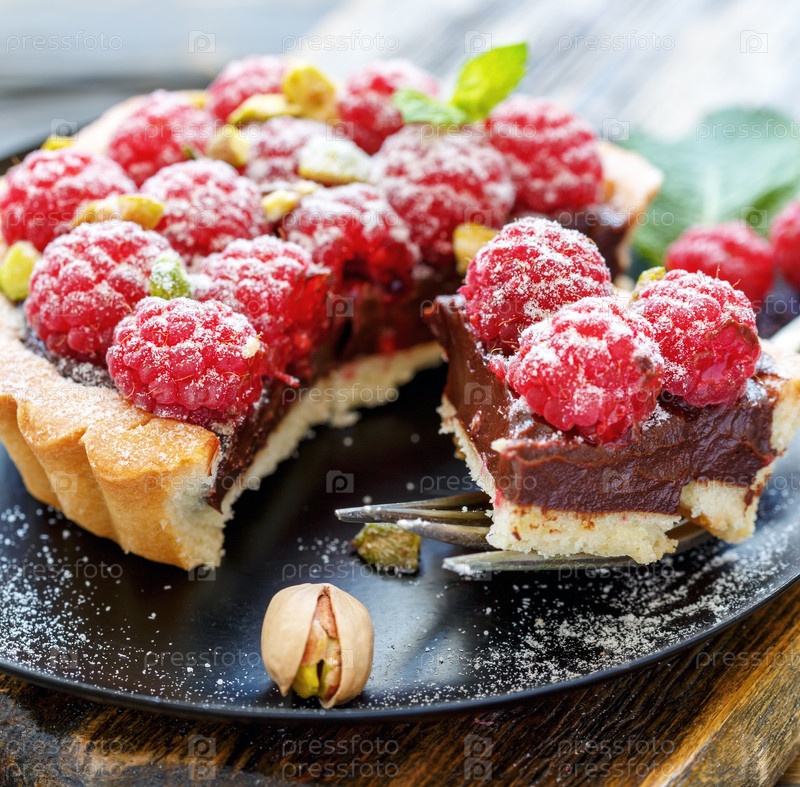 Кусок тарталетки с шоколадом и малиной