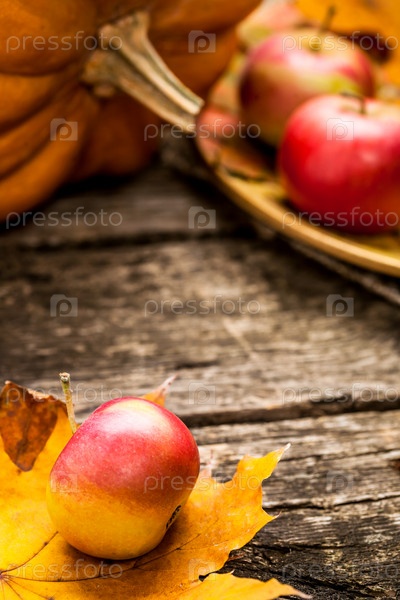 Осенние кленовые листья и яблоки на старом деревянном фоне