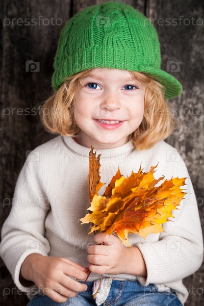 Девочка с букетом желтых осенних листьев