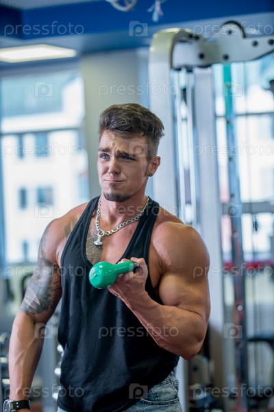 Парень позирует с гантелями
