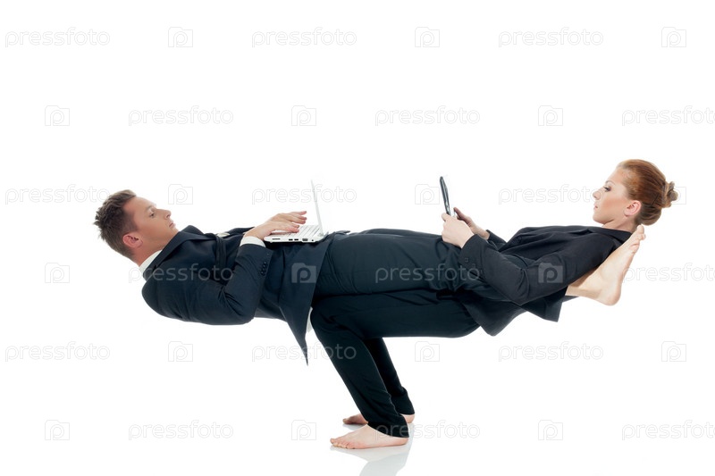 Занятые партнеры позируют в нереальной позе с ноутбуками