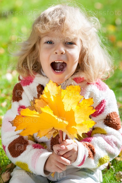 Девочка с букетом желтых осенних листьев