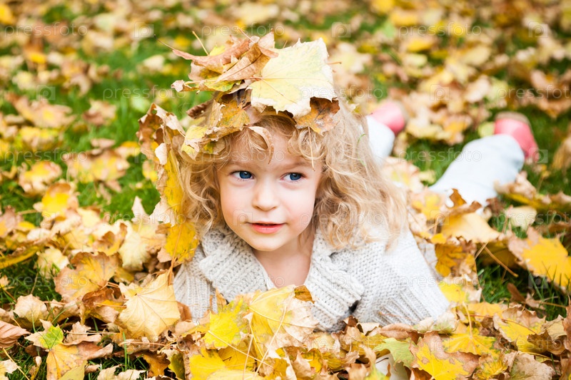 Счастливая девочка лежит в желтых осенних листьях в осеннем парке