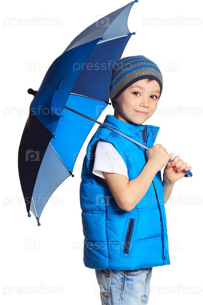 Пятилетний мальчик держит синий зонтик, изолированный на белом фоне