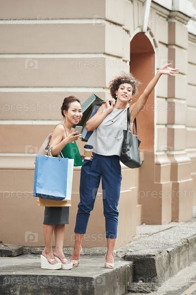 Две женщины ловят такси на улице