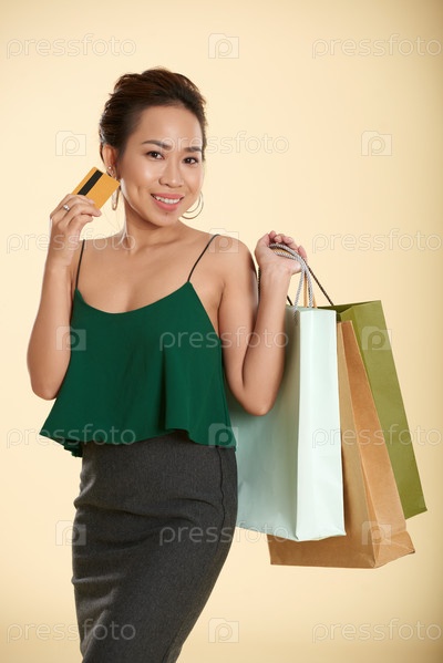 Портрет привлекательной вьетнамской леди с кредитной картой и сумками