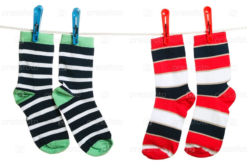 Две пары полосатых носков висят на веревке для белья, изолированные на белом фоне