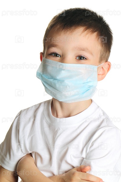 Пятилетний мальчик в медицинской маске, изолированный на белом фоне